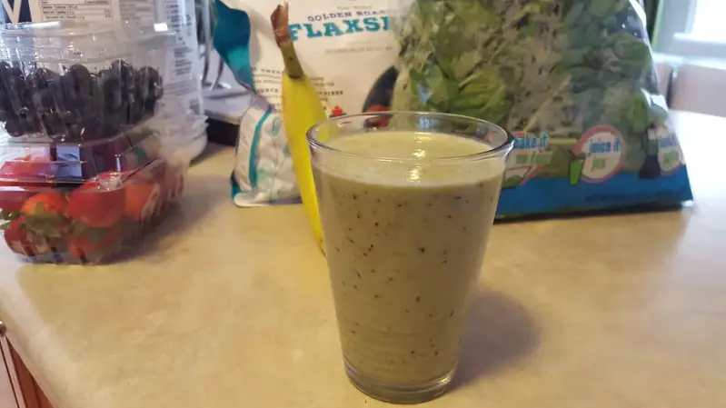 This glass contains Spinach, berries, banana, flax seed, protein powder, and almond milk.